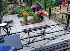 Подготовленную почву застелили геотекстилем, который будет препятствовать проростанию сорной травы в плиточных швах. В это же время на территории могилы были дополнительно установлены лавочка и столик.