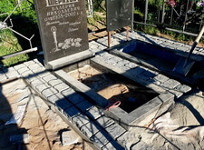 Уложив периметр, мы застелили территорию места захоронения геотекстилем, и выложили брусчатку вокруг памятников, предварительно установив лавочку со столиком.